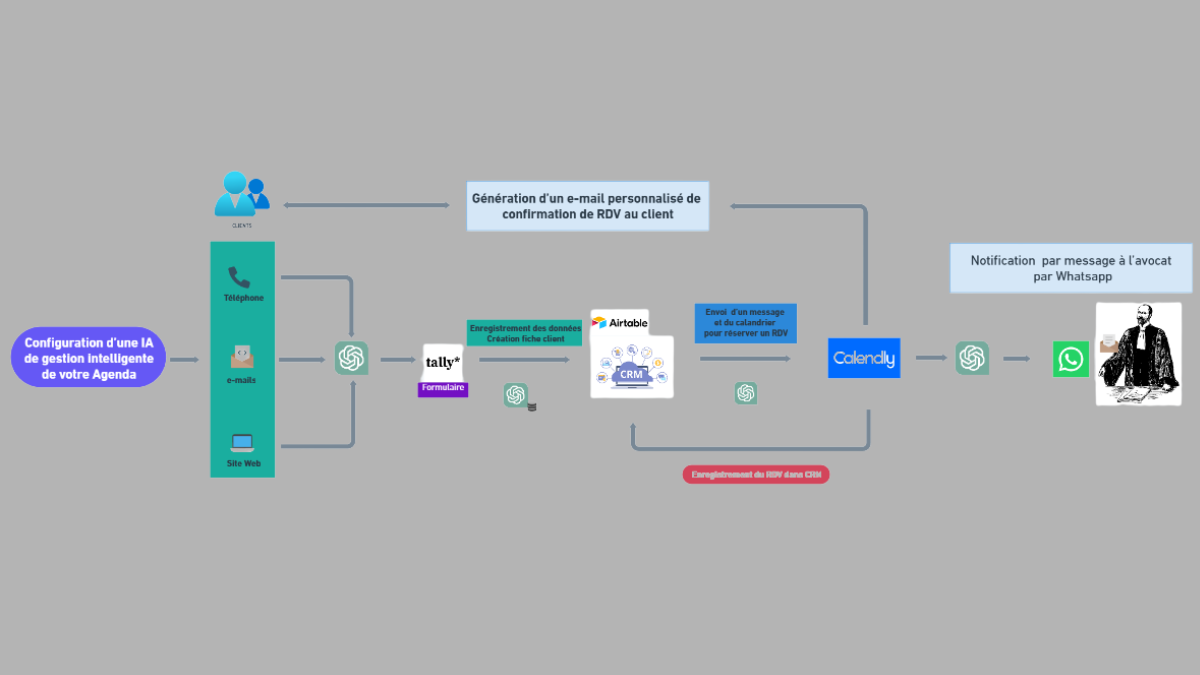 L’agenda intelligent cabinet juridique automatise prise de rendez-vous, confirmations et reprogrammations. Intégration complète avec notre écosystème d’automatisation pour un cabinet 2.0.